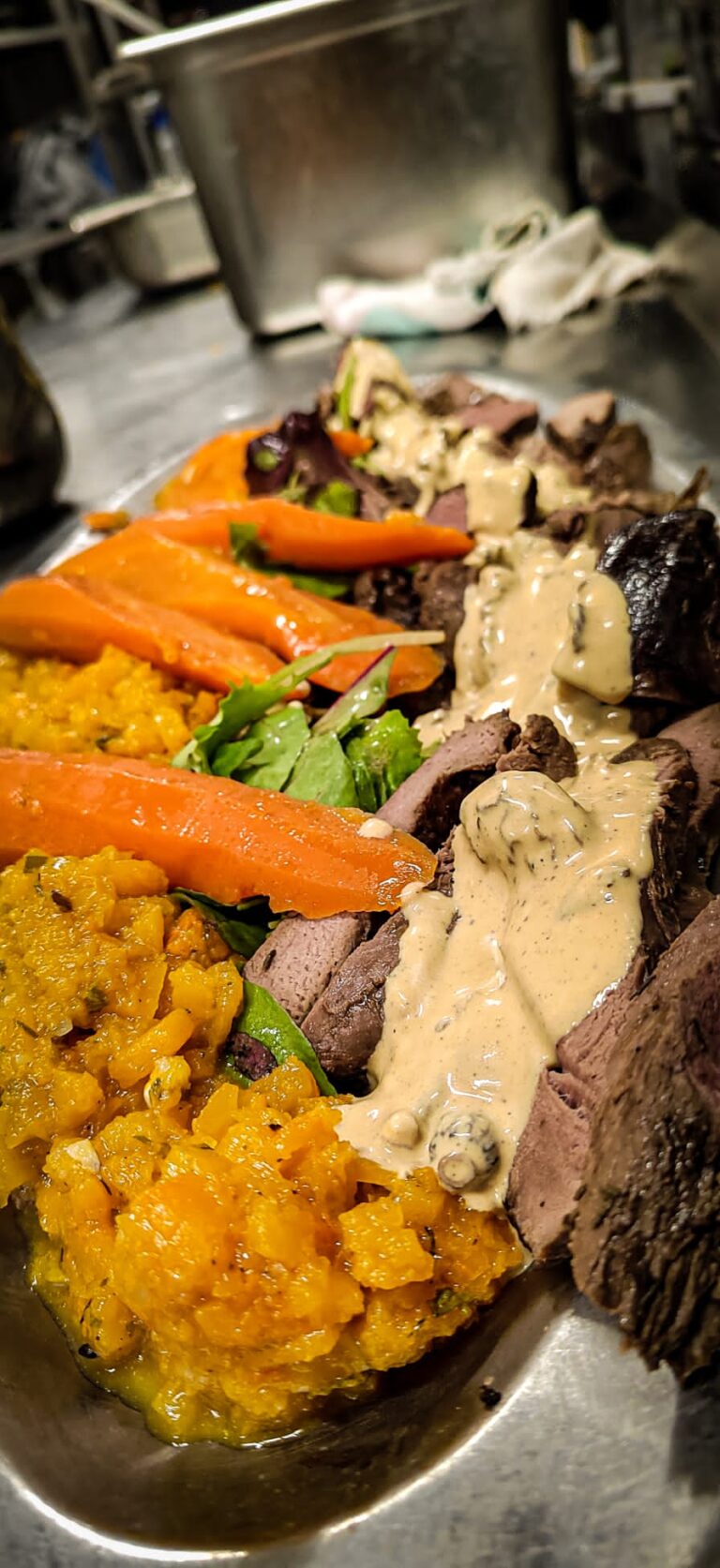 Vous mangez sur place ? Laissez-vous surprendre par notre formule avec le buffet d’entrées froides (salades, quiches, verrines…), suivi du plat, fromage et dessert. Le vin et le café sont compris.